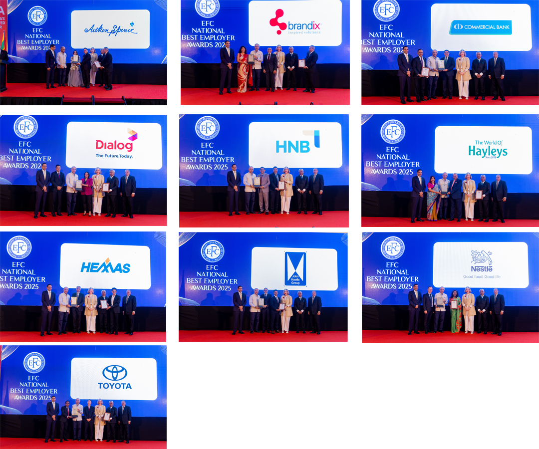 The Best Employer Award winners were Aitken Spence PLC, Brandix Apparel Ltd, Commercial Bank of Ceylon PLC, Dialog Axiata PLC, Hatton National Bank PLC, Hayleys PLC, Hemas Holdings, John Keells Holdings PLC, Nestlé Lanka Ltd, and Toyota Lanka Ltd.